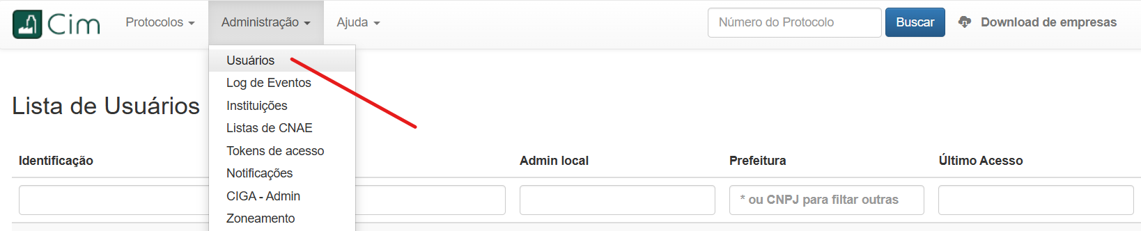 Para visualizar a lista de Administradores Locais, acesse o menu "Ajuda" => "Administradores.