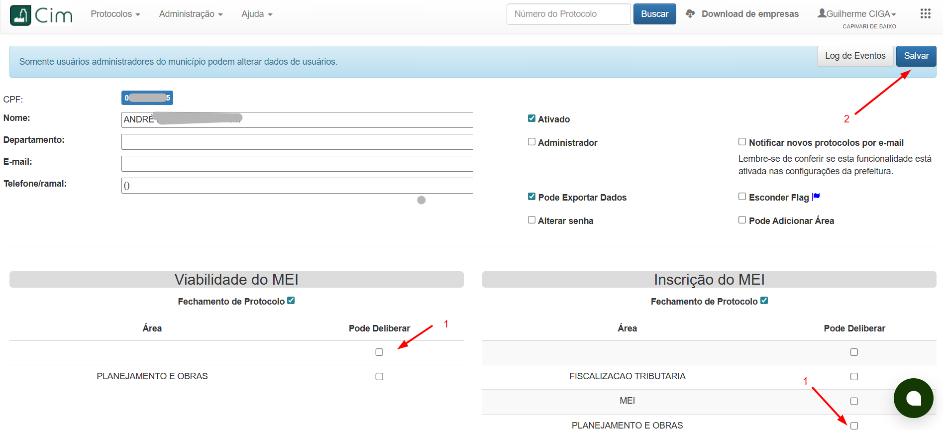 3) Dentro do perfil do usuário, selecione quais as áreas o usuário terá permissão de deliberação [1] e depois clique em "Salvar" [2]: